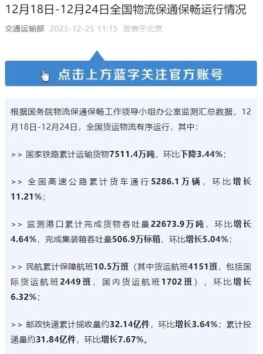 根據(jù)國務(wù)院物流保通保暢工作領(lǐng)導(dǎo)小組辦公室監(jiān)測匯總數(shù)據(jù),12月18日-12月24日,國家鐵路累計運(yùn)輸貨物7511.4萬噸,環(huán)比下降3.44%;全國高速公路累計貨車通行5286.1萬輛,環(huán)比增長11.21%;監(jiān)測港口累計完成貨物吞吐量22673.9萬噸,環(huán)比增長4.64%,完成集裝箱吞吐量506.9萬標(biāo)箱,環(huán)比增長5.04%。