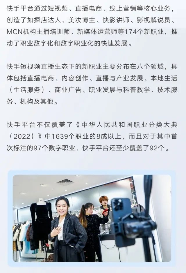 另外,快手平臺通過短視頻、直播電商、線上營銷等核心業(yè)務(wù),創(chuàng)造了如探店達人、美妝博主、快影講師、影視解說員、MCN機構(gòu)主播培訓(xùn)師、新媒體運營師等174個新職業(yè),推動了職業(yè)數(shù)字化和數(shù)字職業(yè)化的快速發(fā)展。