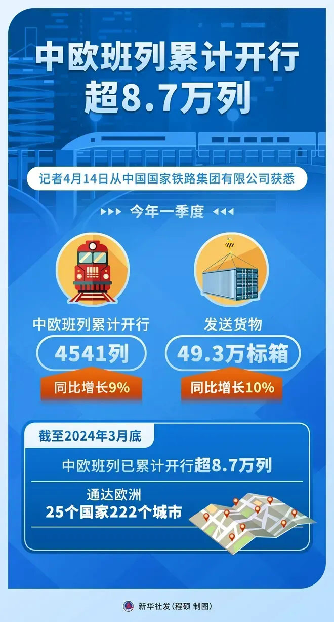 從中國(guó)國(guó)家鐵路集團(tuán)有限公司獲悉,今年一季度,中歐班列累計(jì)開(kāi)行4541列,發(fā)送貨物49.3萬(wàn)標(biāo)箱,同比分別增長(zhǎng)9%、10%。截至2024年3月底,中歐班列已累計(jì)開(kāi)行超8.7萬(wàn)列,通達(dá)歐洲25個(gè)國(guó)家222個(gè)城市。