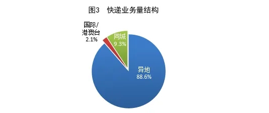 1-4月,同城、異地、國(guó)際/港澳臺(tái)快遞業(yè)務(wù)量分別占全部快遞業(yè)務(wù)量的9.3%、88.6%和2.1%。與去年同期相比,同城快遞業(yè)務(wù)量的比重下降0.2個(gè)百分點(diǎn),異地快遞業(yè)務(wù)量的比重上升0.2個(gè)百分點(diǎn),國(guó)際/港澳臺(tái)業(yè)務(wù)量的比重基本持平。