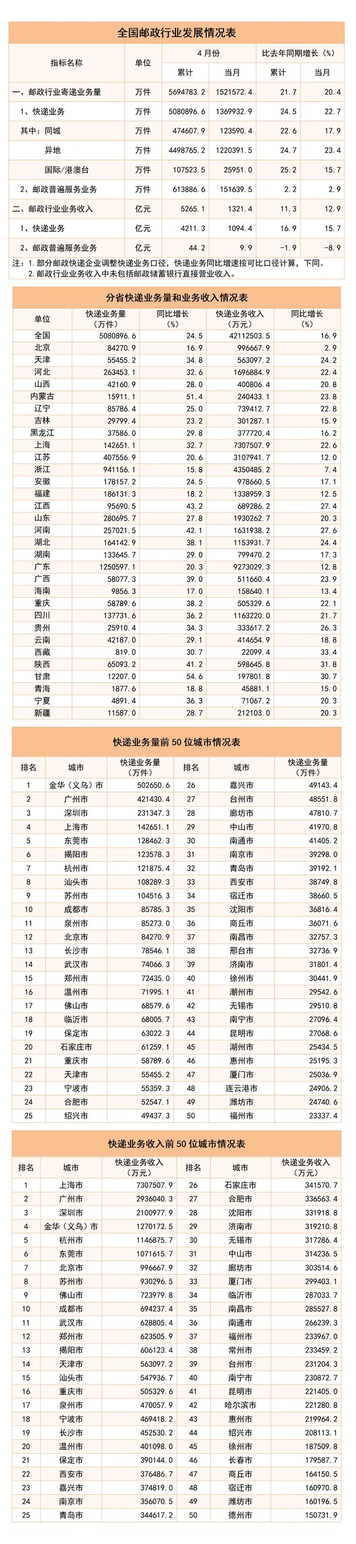 4月份,郵政行業(yè)寄遞業(yè)務(wù)量完成152.2億件,同比增長(zhǎng)20.4%。其中,快遞業(yè)務(wù)量完成137.0億件,同比增長(zhǎng)22.7%。