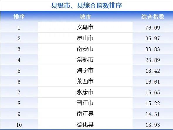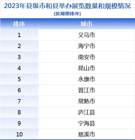 中國會展經(jīng)濟研究會線上發(fā)布的《2023年中國展覽數(shù)據(jù)統(tǒng)計報告》(以下簡稱《報告》)顯示,2023年,義烏會展綜合實力以絕對優(yōu)勢位列全國縣級市首位。排名前五名的分別為義烏、昆山、南安、常熟、海寧。