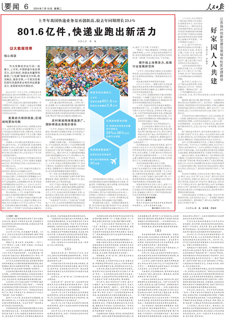 “上半年,市場發(fā)展動(dòng)力強(qiáng)勁,行業(yè)統(tǒng)籌全網(wǎng)資源,在有效滿足多樣化寄遞需求的同時(shí),助力消費(fèi)需求持續(xù)釋放?!眹亦]政局有關(guān)負(fù)責(zé)人表示。