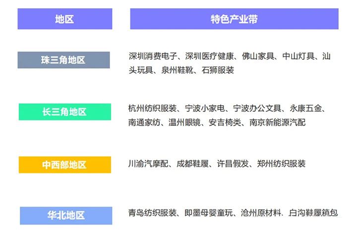 1. 形成電商集聚化發(fā)展:中國跨境電商進出口總額排名前五的省份占跨境電商進出口總額比重從2021年的40.63%提升到2022年的69.7%。東部沿海地區(qū)成為中國跨境電商的集聚區(qū),廣東、山東、浙江、江蘇等地的跨境電商綜合試驗區(qū)實現了地級市全覆蓋,形成了明顯的集聚效應。例如,廣東順德被譽為“中國小家電之都”,浙江諸暨成為全國最大的襪子生產基地,山東青島則以假睫毛生產基地聞名,年產量占全球份額的70% 。