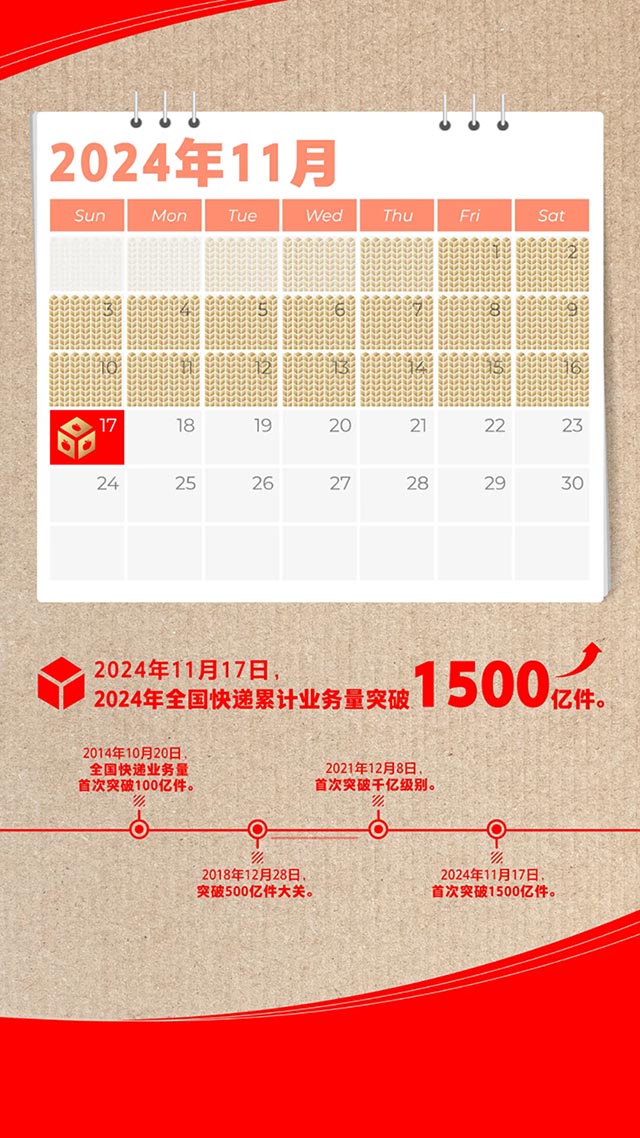 2024年11月17日16時29分,在國家郵政局郵政業(yè)安全中心中國快遞大數(shù)據(jù)平臺的大屏幕上,不斷滾動的數(shù)字彈出了“150000000000”的超長字符,我國快遞年業(yè)務(wù)量首次突破1500億件大關(guān)。與此同時,千里之外的甘肅天水,作為今年第1500億件快件——剛被極兔速遞快遞員攬收的一箱花牛蘋果,就已經(jīng)開始了奔向位于重慶的收件人的旅程,這位消費者幾個小時之前從拼多多平臺下了這一單。