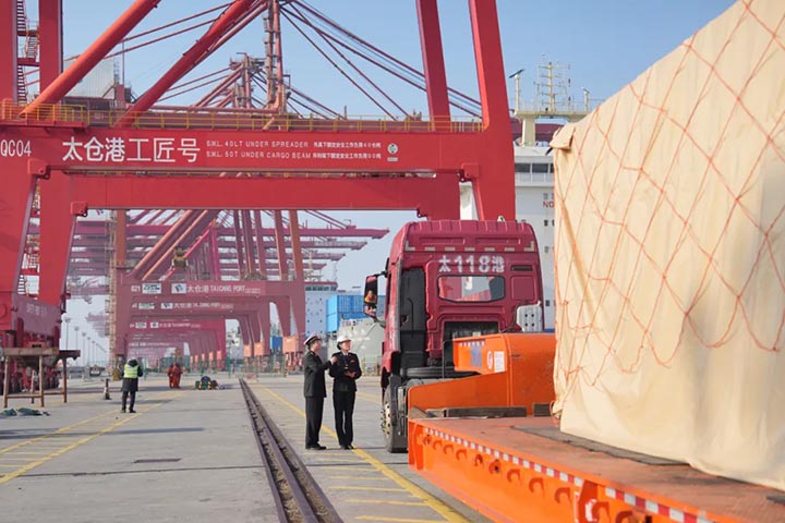 12月26日,南京海關(guān)所屬太倉海關(guān)關(guān)員對采用“聯(lián)動接卸”監(jiān)管模式進口的貨物開展現(xiàn)場監(jiān)管