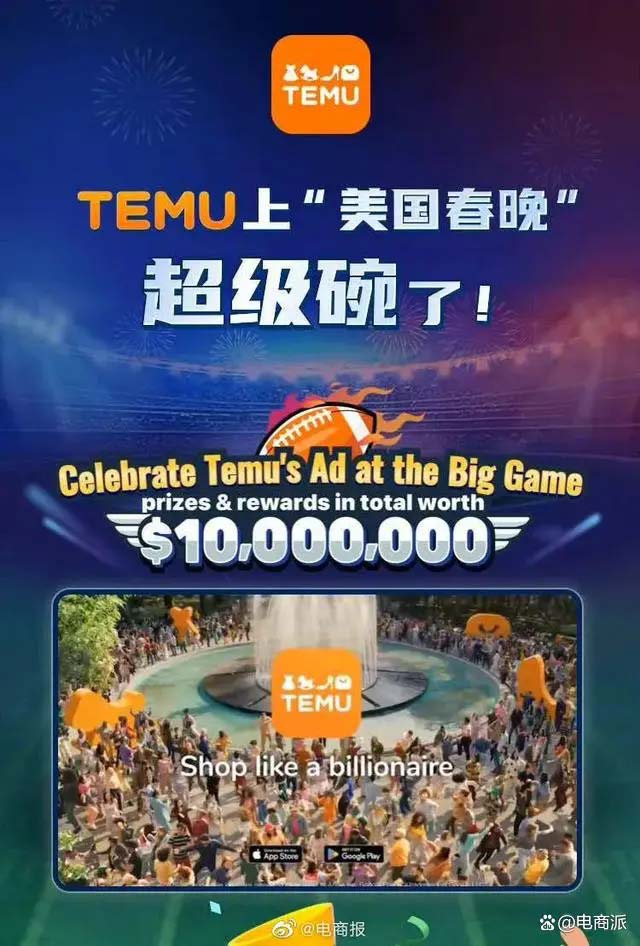 據(jù)悉,Temu自2022年9月在美國(guó)正式上線,并憑借極致低價(jià)和燒錢(qián)營(yíng)銷(xiāo)一路狂飆。在2023年2月,僅上線五個(gè)月的Temu豪擲1400萬(wàn)美元連續(xù)兩次買(mǎi)下“美國(guó)春晚”超級(jí)碗的30秒廣告位,成為有史以來(lái)在超級(jí)碗投放廣告的最年輕品牌之一,并創(chuàng)下該賽事廣告的歷史最高價(jià)。Temu的洗腦廣告詞“Shop like a billionaire"(像億萬(wàn)富翁一樣購(gòu)物 )一度在美國(guó)人中流行。獲客效果立竿見(jiàn)影。Sensor Tower數(shù)據(jù)顯示,2022年超級(jí)碗節(jié)目播出當(dāng)晚,Temu的下載量激增了45%,日活躍用戶增長(zhǎng)了20%。在超級(jí)碗比賽周末有超過(guò)42.6萬(wàn)人下載了Temu應(yīng)用。上線后的短短一年時(shí)間,Temu從美國(guó)接連擴(kuò)展到了加拿大、德國(guó)、法國(guó)、英國(guó)等其他國(guó)家和地區(qū),先從歐美布局,再挺進(jìn)日本、韓國(guó)等亞洲地區(qū),目前Temu的目光正在瞄準(zhǔn)東南亞。
