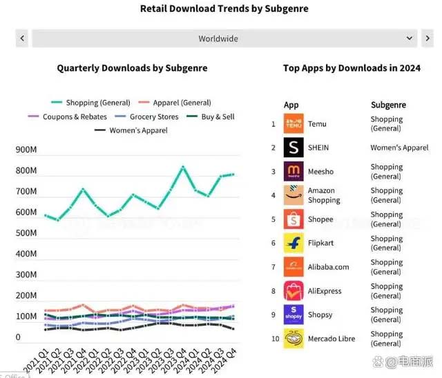 另?yè)?jù)Sensor Tower的《2024年電商應(yīng)用及電商相關(guān)品牌市場(chǎng)洞察》,2024年,Temu全球下載量達(dá)5.5億,同比增長(zhǎng)69%。截至2024年12月,Temu全球累計(jì)下載量接近9億次,牢牢占據(jù)全球電商應(yīng)用下載量和增速的榜首。
