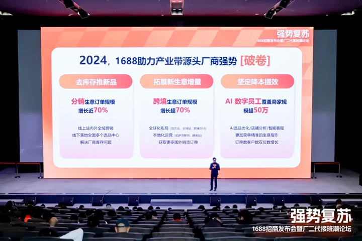 據(jù)悉,1688日前啟動“產(chǎn)業(yè)帶強勢復(fù)蘇”招商活動。本次招商的對象是產(chǎn)業(yè)帶源頭廠商,重點是正經(jīng)歷“廠二代”接班、加速數(shù)字化轉(zhuǎn)型、擁抱AI技術(shù)應(yīng)用和嘗試跨境市場的工廠,尤其是具備小單快返和輕定制能力的品牌代工廠以及“專精特新”企業(yè)。1688將為商家提供“雙?!?/strong>服務(wù),即保證獲客數(shù)量和訂單數(shù)量,保證商家有合理利潤去做工廠數(shù)字化轉(zhuǎn)型升級。