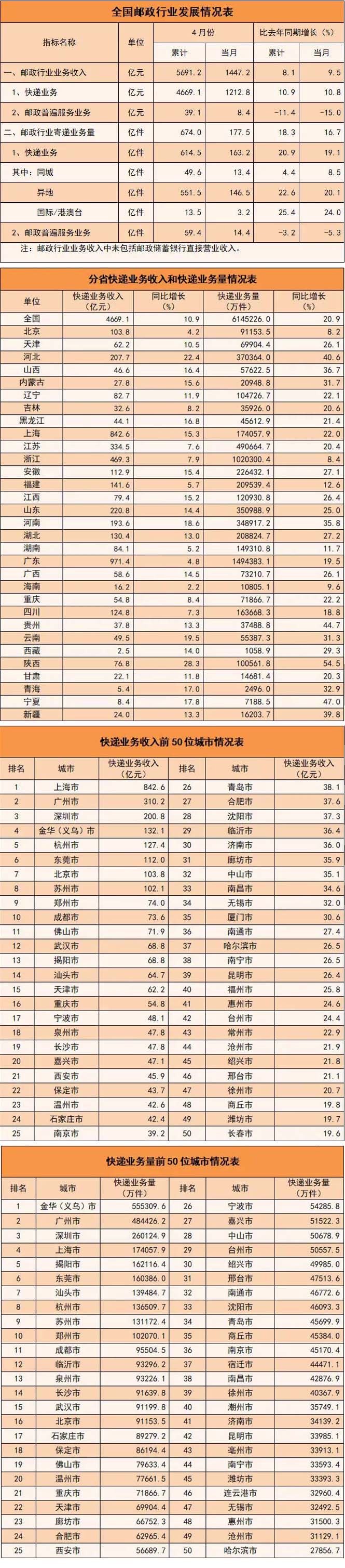 4月份,郵政行業(yè)業(yè)務收入(不包括郵政儲蓄銀行直接營業(yè)收入)完成1447.2億元,同比增長9.5%。其中,快遞業(yè)務收入完成1212.8億元,同比增長10.8%。