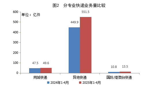 1—4月,同城快遞業(yè)務量累計完成49.6億件,同比增長4.4%;異地快遞業(yè)務量累計完成551.5億件,同比增長22.6%;國際/港澳臺快遞業(yè)務量累計完成13.5億件,同比增長25.4%。