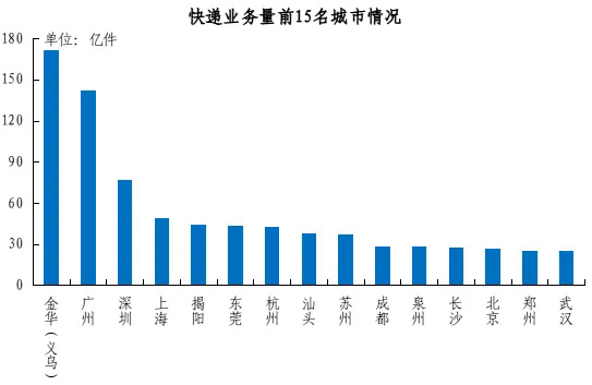 快遞業(yè)務(wù)量排名前十五位的城市依次是金華(義烏)、廣州、深圳、上海、揭陽、東莞、杭州、汕頭、蘇州、成都、泉州、長沙、北京、鄭州和武漢,其快遞業(yè)務(wù)量合計占全部快遞業(yè)務(wù)量的比重達(dá)到46.2%。