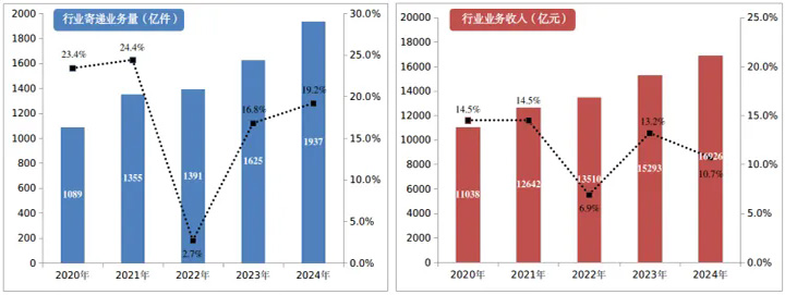 2024年郵政行業(yè)寄遞業(yè)務(wù)量完成1936.8億件,同比增長19.2%。其中,快遞業(yè)務(wù)量完成1750.8億件,同比增長21.5%。