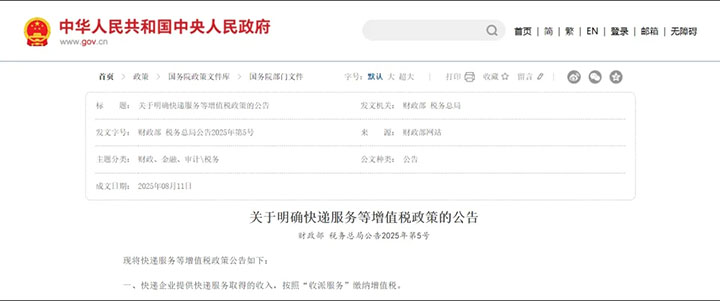 關(guān)于明確快遞服務(wù)等增值稅政策的公告