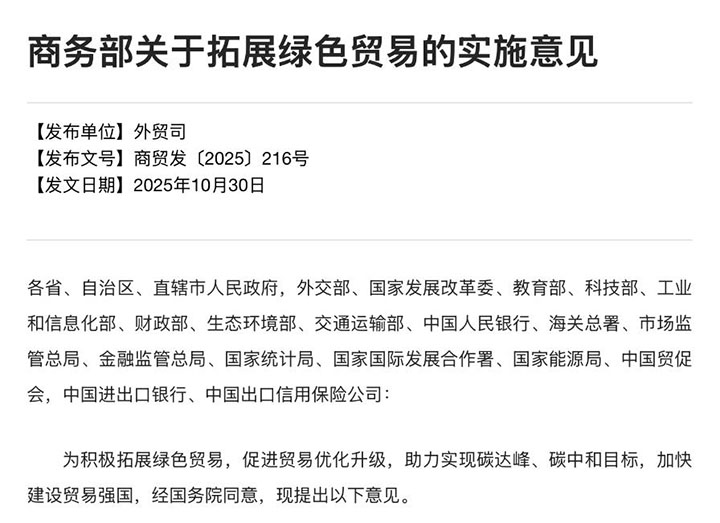 在全球綠色低碳轉(zhuǎn)型浪潮下,綠色貿(mào)易正成為國際經(jīng)貿(mào)競爭的新焦點(diǎn)。近日,商務(wù)部發(fā)布《關(guān)于拓展綠色貿(mào)易的實(shí)施意見》(以下簡稱《意見》),圍繞產(chǎn)品碳足跡、碳定價(jià)、綠證綠電等關(guān)鍵環(huán)節(jié)提出具體舉措,建立健全綠色貿(mào)易支撐保障體系。